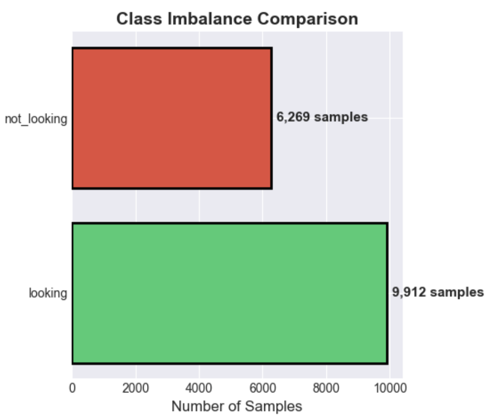 This gives us a value between 0 and 1 if we have more looking cases, which as you can see in figure 1, we do. By doing this we underweight the loss values given by predicting looking, meaning it has less impact in the gradient update. POS_weight aims to deter the model from always predicting the majority class.