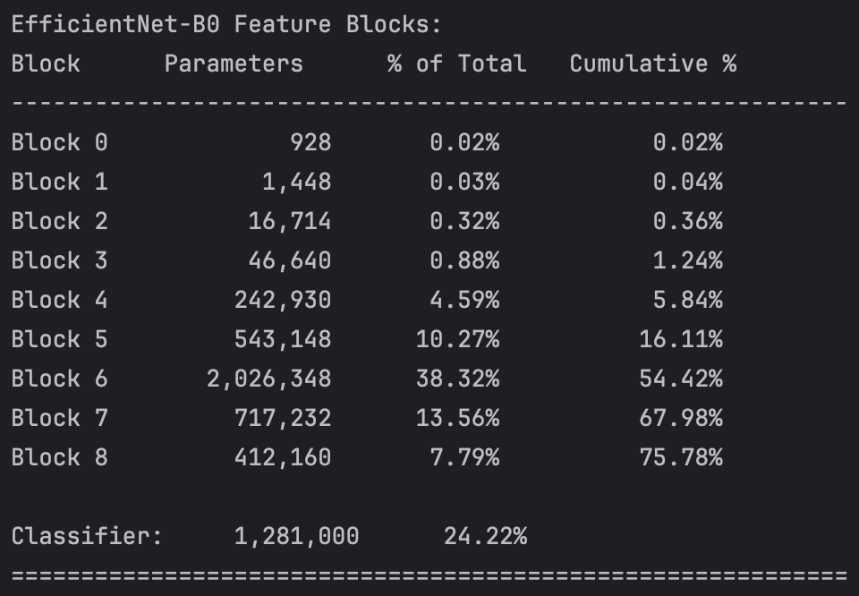 Armed with the 3 inputs, we create the gaze vectors and then undertake phase 1 of training. In this phase most blocks of the pre-trained EfficientNetB0 are enabled. We freeze the first 4 blocks, accounting for roughly 5% of total parameter count (as can be seen in figure 2), so 95% of the model’s weights are available to be updated.